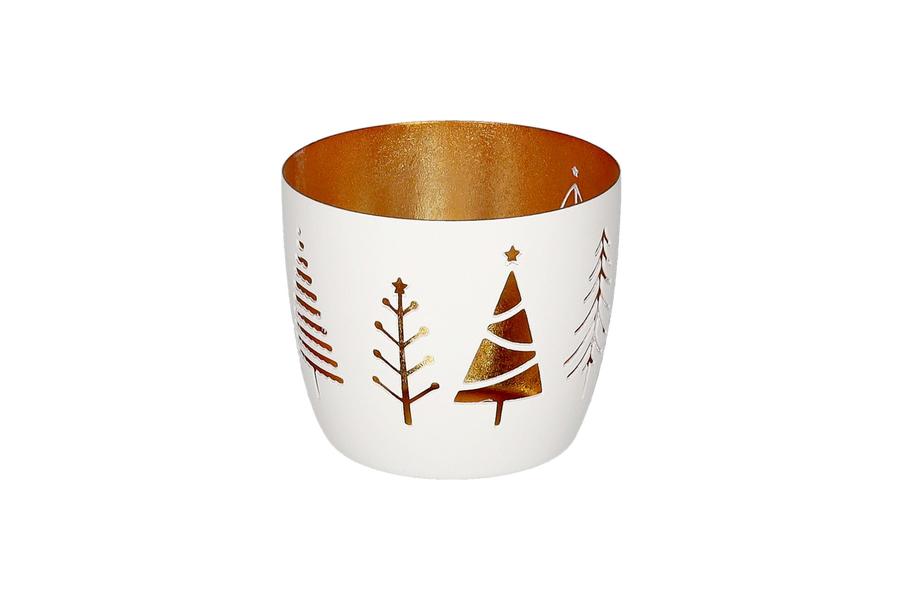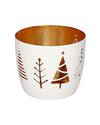 Madras, photophore, M avec motif sapins coloris blanc/or. Hauteur 8.5cm x Ø 10cm